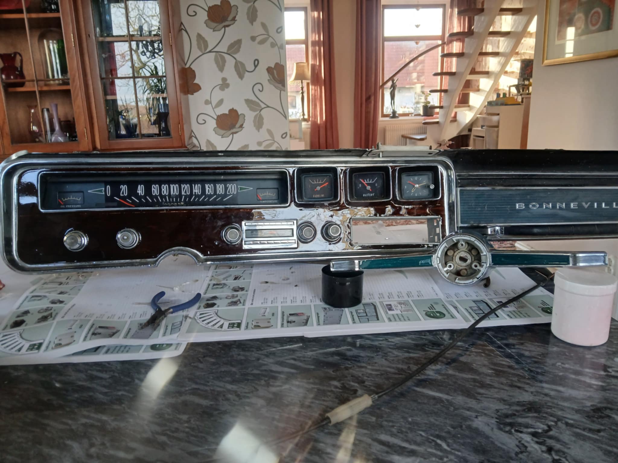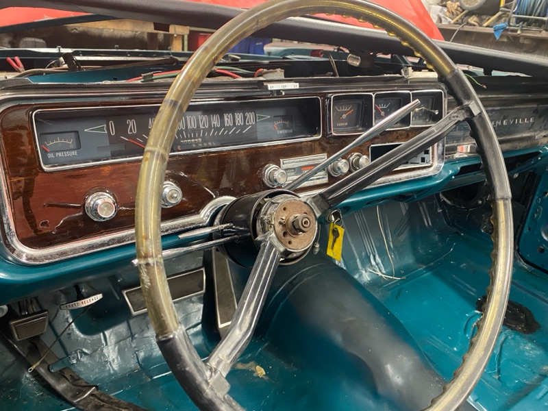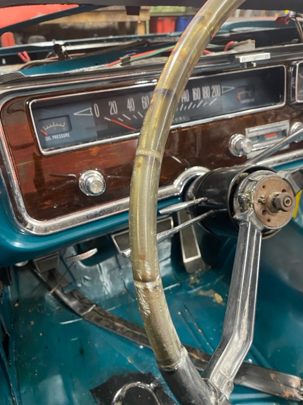 I övrigt så har det blivit en hel del lackat inuti och en del större plåt detaljer tillfälligt monterat. Instrument panelen tillfixad med ett rejält lager epoxy och ratten lagad med det samma. Ratten ser fortfarande ganska skabbig ut men hade jag bara kommit ihåg att ta ett före foto så är den numera drömsnygg. Måste bita ihop och orka polera mera meeeennn…. Inte min favorit grej. Min pappa brukar säga ett rätt skött jobb kan vara länge… kan ju inte fixa allt på en gång 😝